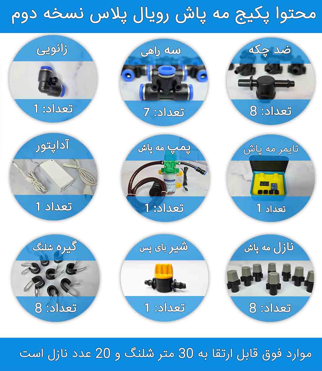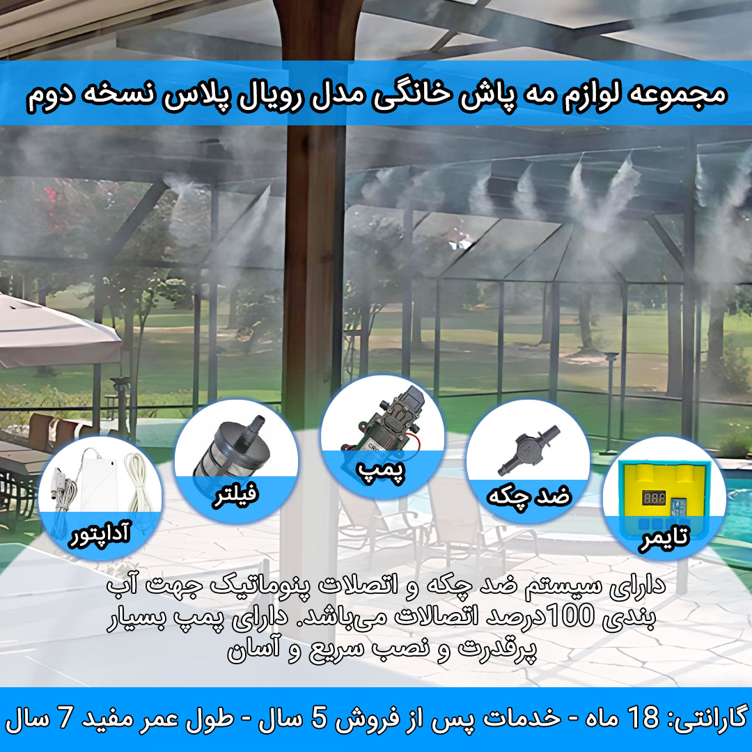 با عرض سلام، این کامل ترین پکیج مه پاش خانگی است. این مدل سیستم ضد چکه، پمپ، تایمر و همه لوازم را دارد، به همراه یک سال گارانتی