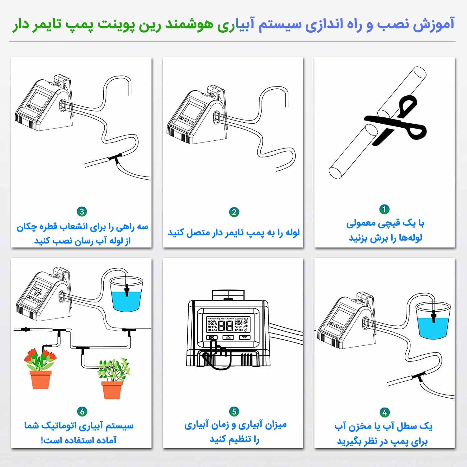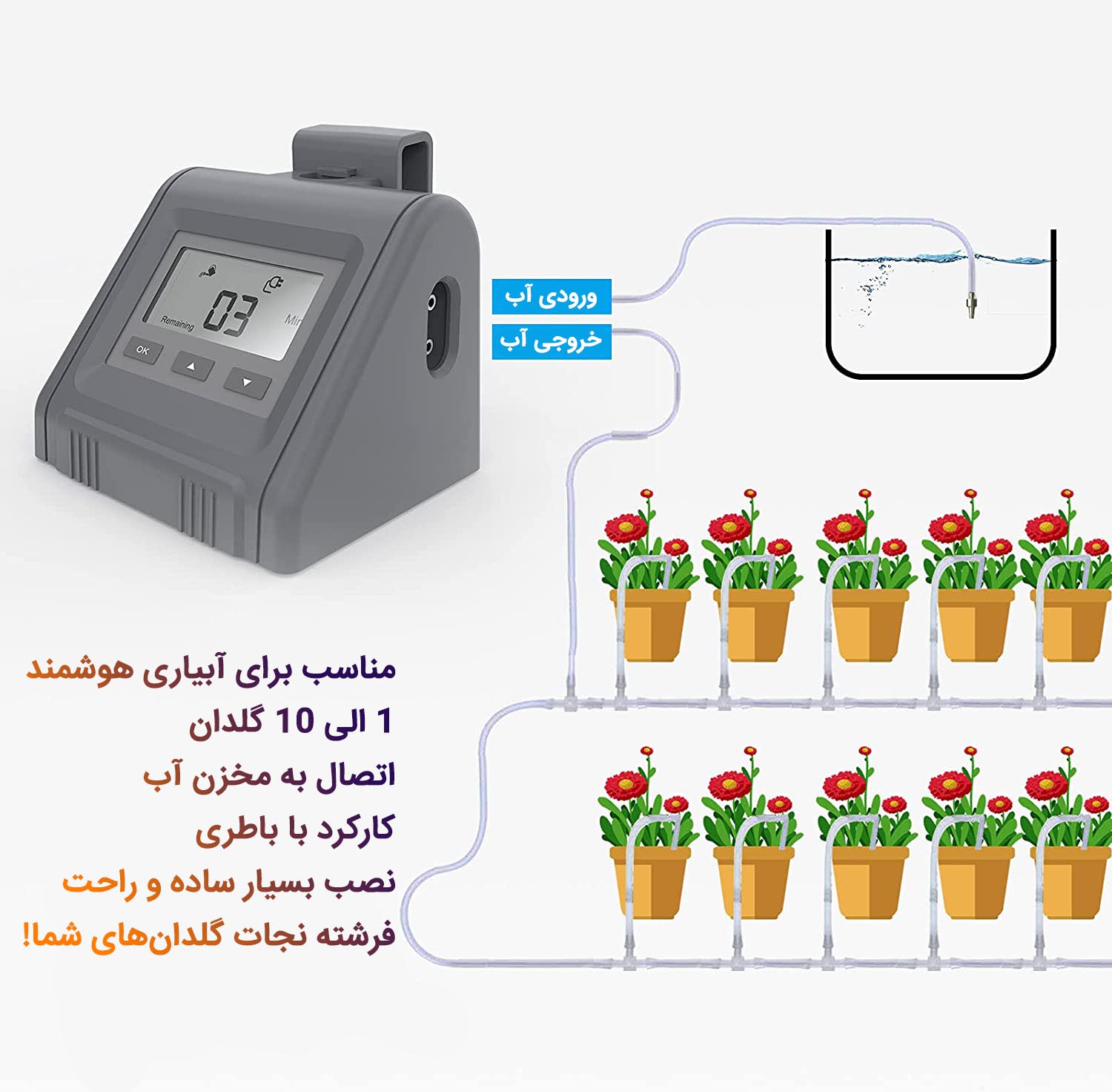این دستگاه داخل خودش پمپ دارد و شما زمان آبیاری گیاهان را روی آن تنظیم میکنید، زمانی که تایم آبیاری برسد دستگاه آب را از داخل مخزن میکشد و به سمت گلدانها آب میفرستد.
