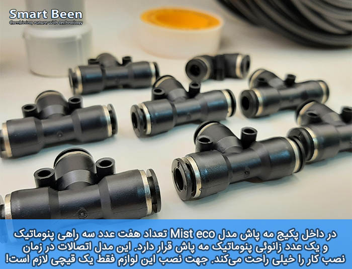 جهت نصب سادهتر و راحت تر از پایه نازلهای مخصوص مه پاش را برای شما در نظر گرفتیم. در داخل این پکیج لوازم مورد نیاز برای نصب مه پاش قرار دارد. 7 عدد سه راهی و 1 عدد زانوی. از سه راهی برای نصب نازل مه پاش بین خط و از زانوی جهت آب بند کردن انتهای خط استفاده میشود. جهت آشنایی بهتر حتماً ویدئو آموزش نصب را مشاهده کنید.