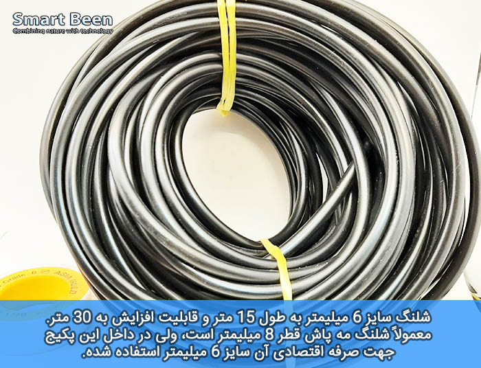 استاندارد اصلی مه پاش در دنیا این است که حتماً باید از شلنگ 8 میلیمتر با گوشته سایز 5.8 استفاده شود، ولی چون این مدل شلنگ گران تر از شلنگ 6 میلیمتراست برای اینکه این پکیج برای همه قابل تهیه باشد از شلنگ سایز 6 میلیمتر استفاده کردیم. این مدل شلنگ کار راه انداز است و معمولاً مشکلی پیش نمیاید. ولی اگر فضای شما بسیار گرم و تابش آفتاب مستقیم دارید حتماً از لوازم مه پاش استاندارد استفاده کنید.