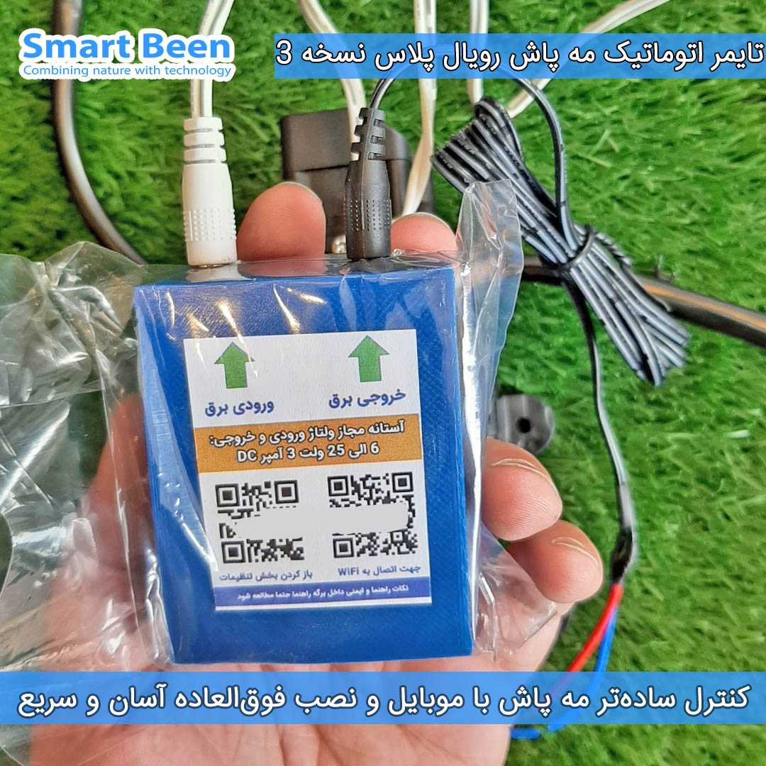 کنترل مه پاش رویال پلاس نسخه سوم از قبل سادهتر شده و شما میتوانید با موبایل کنترل کنید، فرقی ندارد سیستم عامل موبایل شما چه باشد، هم اندروید، هم ایفون و حتی لب تاپ و ویندوز و هر سیستم عاملی که دارید میتوانید این تایمر را کنترل کنید چون همه چیز با مرورگر کار میکند و فقط کافی است کد QR پشت دستگاه را اسکن کنید و به آن متصل شوید و تنظیمات دلخواه مه پاش را روی آن تنظیم کنید. فقط در نظر داشته باشید برای تنظیم این تایمر باید نزدیک تایمر باشید تا بتوانید تنظیمات را ذخیره و کنترل کنید و امکان کنترلر تایمر تا رنج پوشش دهی WiFi تایمر یعنی فاصله ای در حدودا 10 الی 15 متر از دستگاه امکان اتصال به تایمر را دارید.