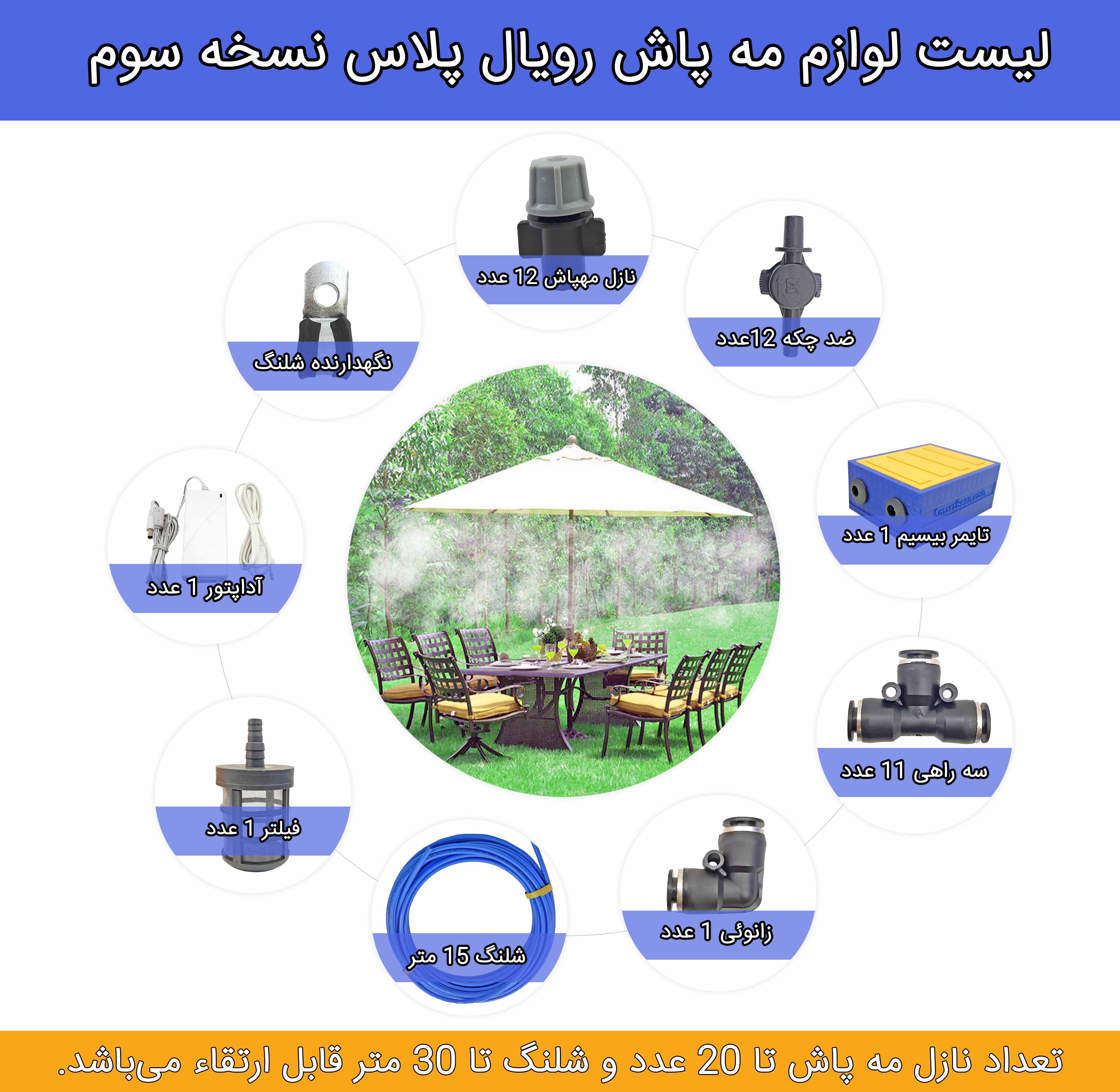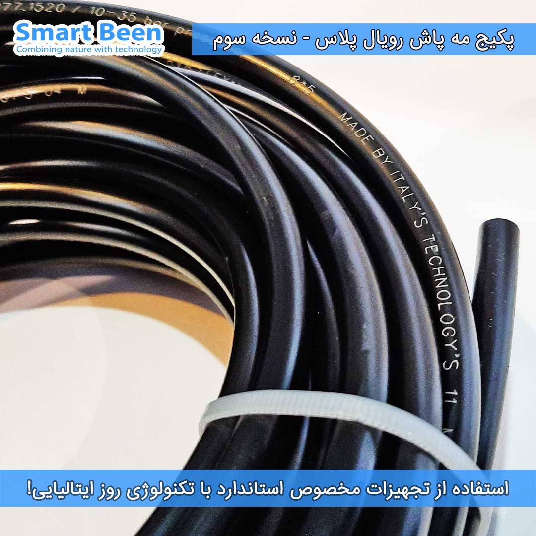 مه پاش رویال پلاس از سال 1394 تا به امروز از قدیمیترین و باسابقهترین مه پاشهای ایران بوده که بر اساس نیاز مشتریان هر روز بروز شده. مه پاش رویال پلاس آماده نصب است جاهای سخت آن را خودمان برایتان نصب شده ارسال میکنیم. (به عنوان مثال سوکت آداپتور پمپ، فیلتر یا خروجی پمپ) بنابراین شما جهت نصب مه پاش شما هیچ وسیله خاصی نیاز ندارید و فقط کافی است با قیچی معمولی شلنگ را برش بزنید و نازلهای مه پاش را روی شلنگ نصب کنید. ضمنا روی شلنگ متر شمار هم دارد تا اگر خواستید فاصله نازلها دقیق و منظم باشد راحت و تمیز نصب کنید.