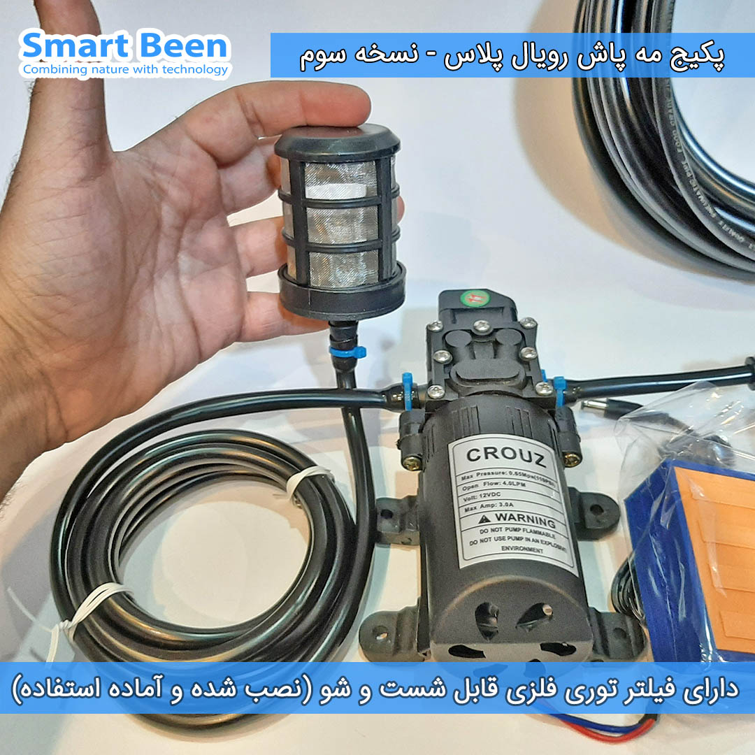در داخل این پکیج ما برای شما فیلتر قابل شست و شو از نوع توری فلزی قرار دادیم. تا زمانی که اگر داخل سطل یا مخزن آبی که میخواهید پمپ مه پاش را یه آن متصل کنید ناخالصیهای مثل برگ، شن و ماسه، یا شاخه و برگ داشت را تصفیه کند تا از گرفتگی نازلهای مه پاش جلوگیری شود. همچنین چون نصب این فیلتر به پمپ و نصب خروجی آن به نازلهای مه پاش برای برخی از کاربران سخت بود ما این قطعه را به صورت پیش ساخته برایتان ارسال میکنیم. یعنی دقیقاً مطابق عکس فوق فیلتر به پمپ متصل است و فقط کافی است فیلتر را داخل سطل یا منبع آب بیندازید (به هیچ وجه این دستگاه را به آب شهری متصل نکنید.). همچنین هر زمان احساس کردید فیلتر رسوب بسته آن را باز کنید (به صورت پیچی با دست باز میشود) و سپس داخل وایتکس قرار دهید تا ناخالصیهای آن شسته شود.