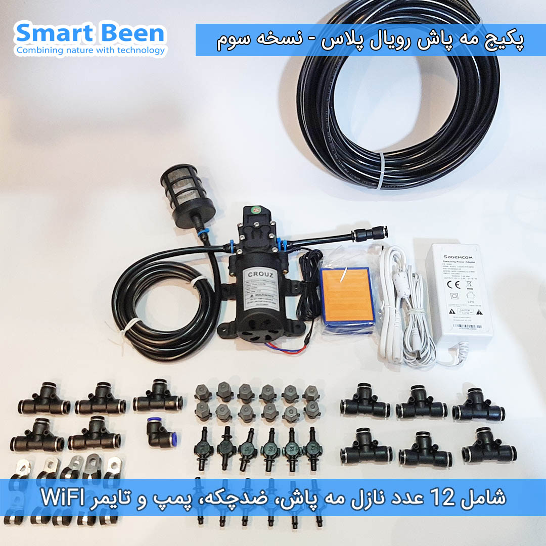 با تشکر از اعتماد و انتقادات سازنده شما، نسخه جدید مه پاش رویال پلاس، نسخه شماره سه آماده عرضه شد. ما در این نسخه تمامی اتصالات را بهبود دادیم. نسخه جدید پمپ با قدرت 10 درصد بیشتر یعنی 110PSI را برای شما داخل پکیج قرار دادیم. تایمر این مدل مه پاش بروزرسانی اساسی شده و میتوانید از طریق موبایل و شبکه WiFi تنظیمات و کنترل مه پاش را به عهده بگیرید. بنابراین اگر در نزدیک محیط WiFi باشید و هر وقت احساس گرما کردید میتوانید از روی موبایل مه پاش را روشن کنید و برنامه تایمر اتوماتیک مه پاش را روی آن تنظیم کنید.