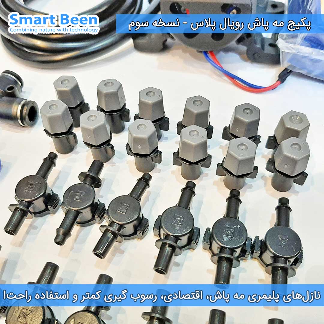داخل پکیج مه پاش رویال پلاس 12 عدد نازل مه پاش پلیمری (یا همان پلاستیکی) قرار دارد. خیلی از خریداران تصور میکنند مه پاش فلزی بهتر از مه پاش پلاستیکی است، که خب تا حدی این امر صحیح است. ولی شرایط نگهداری نازلهای فلزی و هزینه تعویض آنها بالاست!